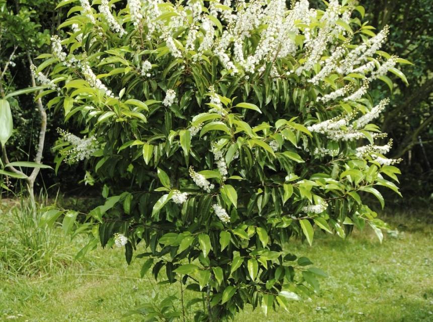 Prunier du Portugal ou laurier du Portugal.Prunus lusitanica. Cet arbuste dense, à croissance lente, peut devenir un petit arbre si on ne le taille pas.