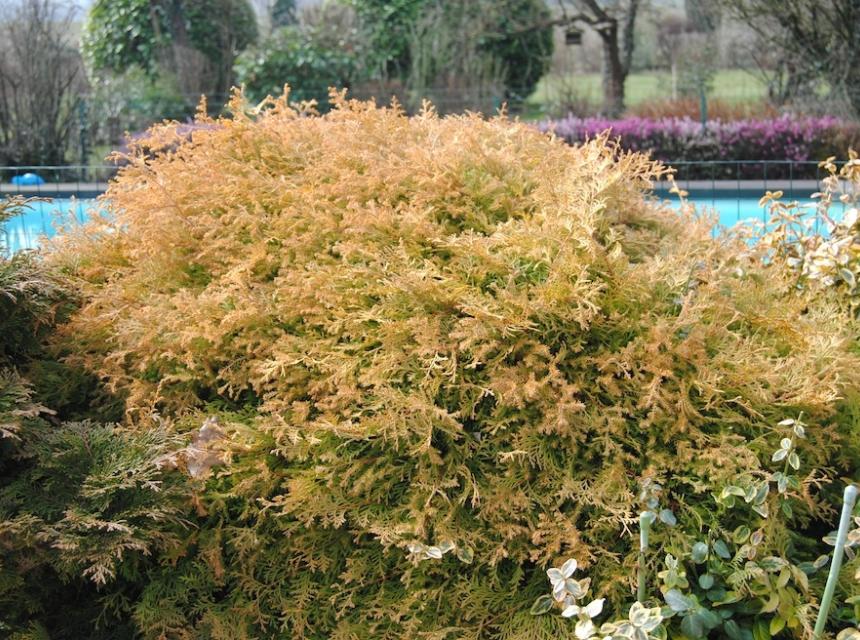 Le Thuya d'Orient nain doré présente un port globuleux et compact avec ses rameaux régulièrement dressés. Son feuillage est vert jaune au printemps et devient bronze en hiver. De croissance lente, ce conifère atteindra 1 mètre de haut et 60 cm de large. On le plantera dans n'importe quel type de sol même calcaire en exposition ensoleillée ou mi-ombragée, en rocaille, bac ou isolé.