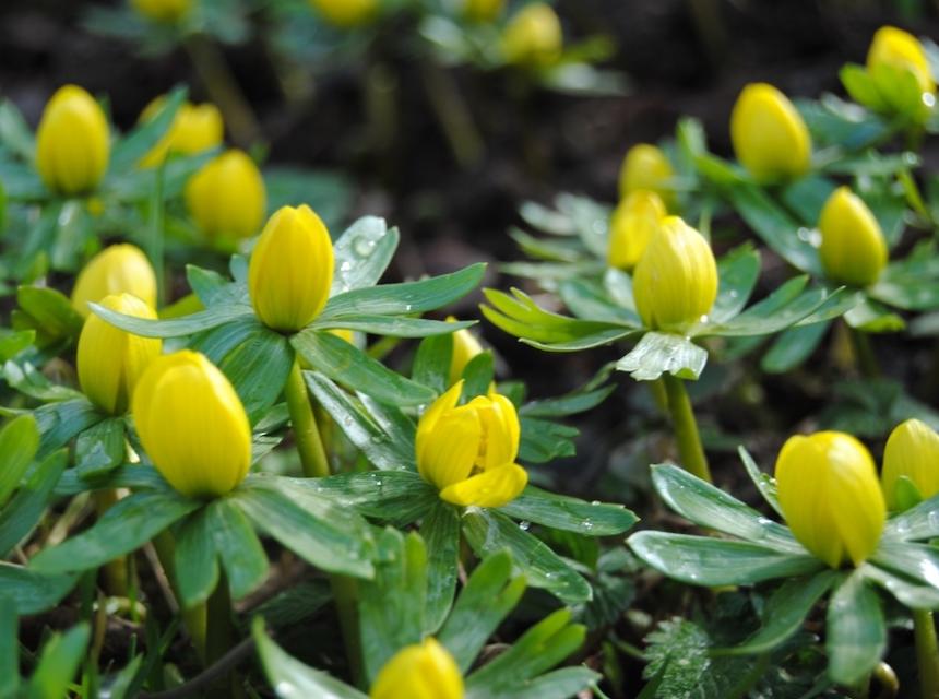 Fleurs jaunes, hâtives, au-dessus d'une touffe de feuilles disséquées, vert brillant. Forme rapidement des colonies, surtout en sol calcaire.