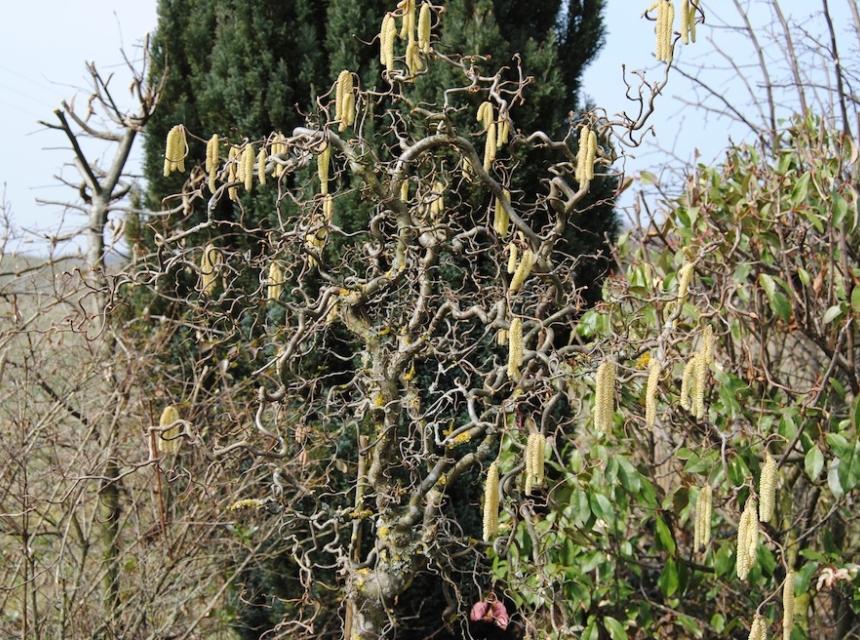 Un très curieux arbuste qui se distingue par ses pousses tordues créant un effet très original. Il est d'autant plus décoratif à la fin de l'hiver lorsque ses branches sinueuses portent une abondante floraison en chatons jaunes pendants. Ses feuilles crispées présentent également un aspect étonnant.